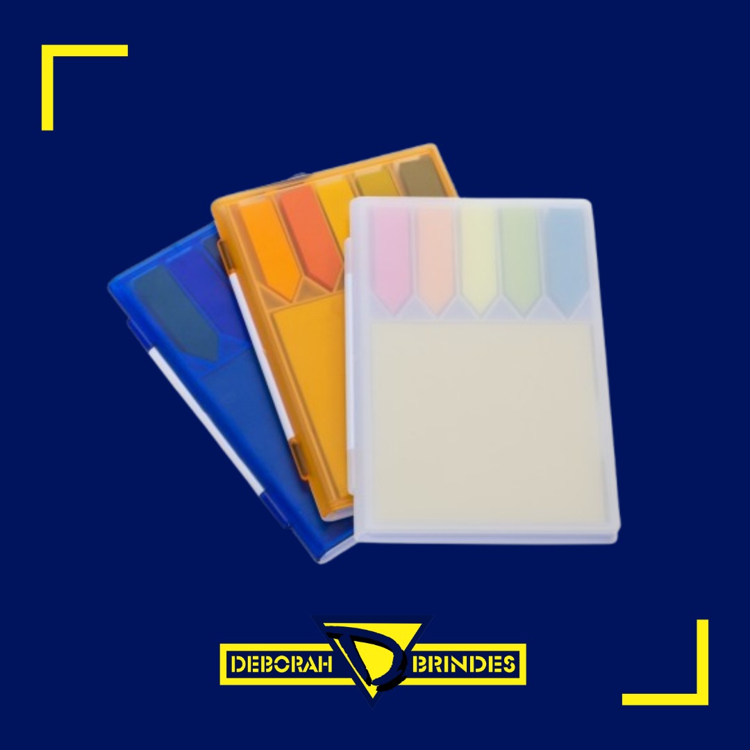 Descrição: Bloco de anotações plástico com autoadesivos, capa colorida e base branca. Possui cinco bloquinhos autoadesivos com aproximadamente 50 folhas cada e um bloco maior com folhas amarelas sem pauta, aproximadamente 50 folhas.